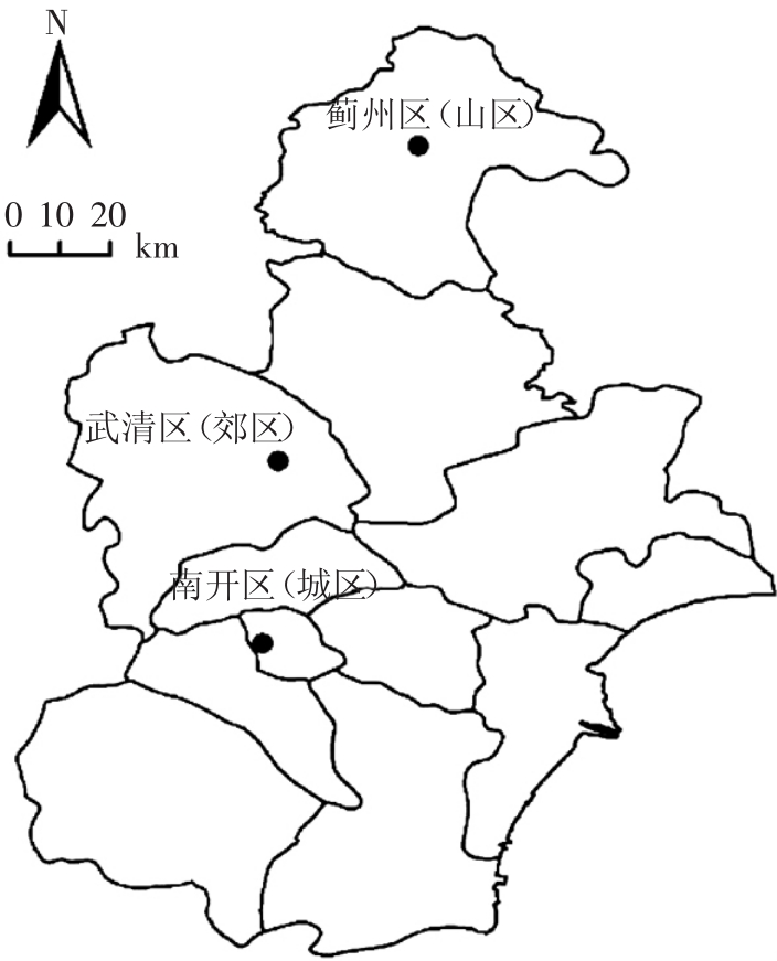 通过分析天津市环境空气质量GIS发布平台的数据发现,城区和郊区的大气污染程度明显高于山区。以空气中 PM2.5为例,城区(591~618 μg·m-3)和郊区浓度(304 μg·m-3)均高于我国空气质量标准(GB 3095—2012)规定的浓度限值(75 μg·m-3),而山区低于该标准限值[15]。因此,本研究选取城区、郊区、山区3个大气污染程度不同的地点作为采样点(图1)。