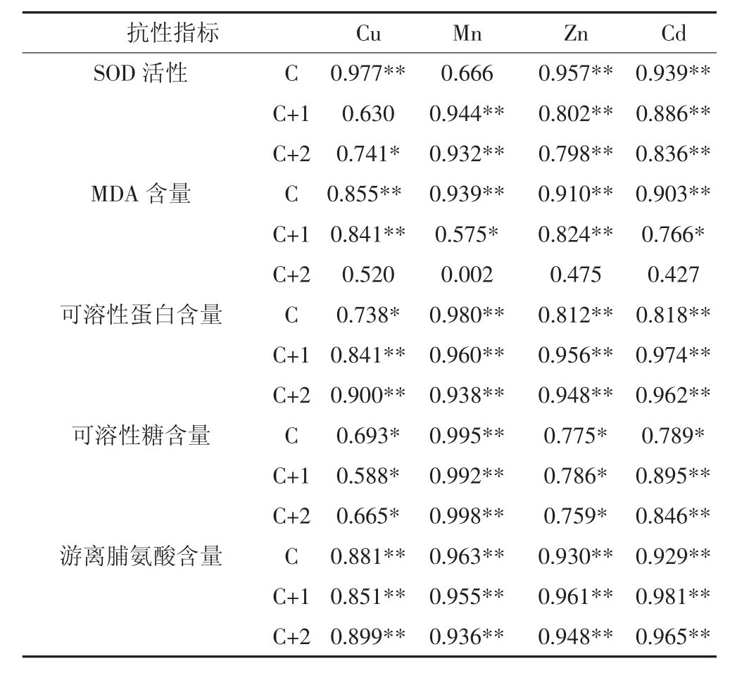 抗性指标 Cu Mn Zn Cd SOD活性 C 0.977** 0.666 0.957** 0.939**C+1 0.630 0.944** 0.802** 0.886**C+2 0.741* 0.932** 0.798** 0.836**MDA含量 C 0.855** 0.939** 0.910** 0.903**C+1 0.841** 0.575* 0.824** 0.766*C+2 0.520 0.002 0.475 0.427可溶性蛋白含量 C 0.738* 0.980** 0.812** 0.818**C+1 0.841** 0.960** 0.956** 0.974**C+2 0.900** 0.938** 0.948** 0.962**可溶性糖含量 C 0.693* 0.995** 0.775* 0.789*C+1 0.588* 0.992** 0.786* 0.895**C+2 0.665* 0.998** 0.759* 0.846**游离脯氨酸含量 C 0.881** 0.963** 0.930** 0.929**C+1 0.851** 0.955** 0.961** 0.981**C+2 0.899** 0.936** 0.948** 0.965**