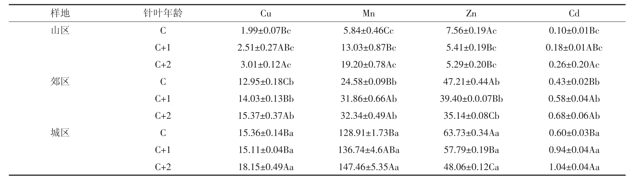 样地 针叶年龄 Cu Mn Zn Cd山区 C 1.99±0.07Bc 5.84±0.46Cc 7.56±0.19Ac 0.10±0.01Bc C+1 2.51±0.27ABc 13.03±0.87Bc 5.41±0.19Bc 0.18±0.01ABc C+2 3.01±0.12Ac 19.20±0.78Ac 5.29±0.20Bc 0.26±0.20Ac郊区 C 12.95±0.18Cb 24.58±0.09Bb 47.21±0.44Ab 0.43±0.02Bb C+1 14.03±0.13Bb 31.86±0.66Ab 39.40±0.0.07Bb 0.58±0.04Ab C+2 15.37±0.37Ab 32.34±0.49Ab 35.14±0.08Cb 0.68±0.06Ab城区 C 15.36±0.14Ba 128.91±1.73Ba 63.73±0.34Aa 0.60±0.03Ba C+1 15.11±0.04Ba 136.74±4.6ABa 57.79±0.19Ba 0.94±0.04Aa C+2 18.15±0.49Aa 147.46±5.35Aa 48.06±0.12Ca 1.04±0.04Aa