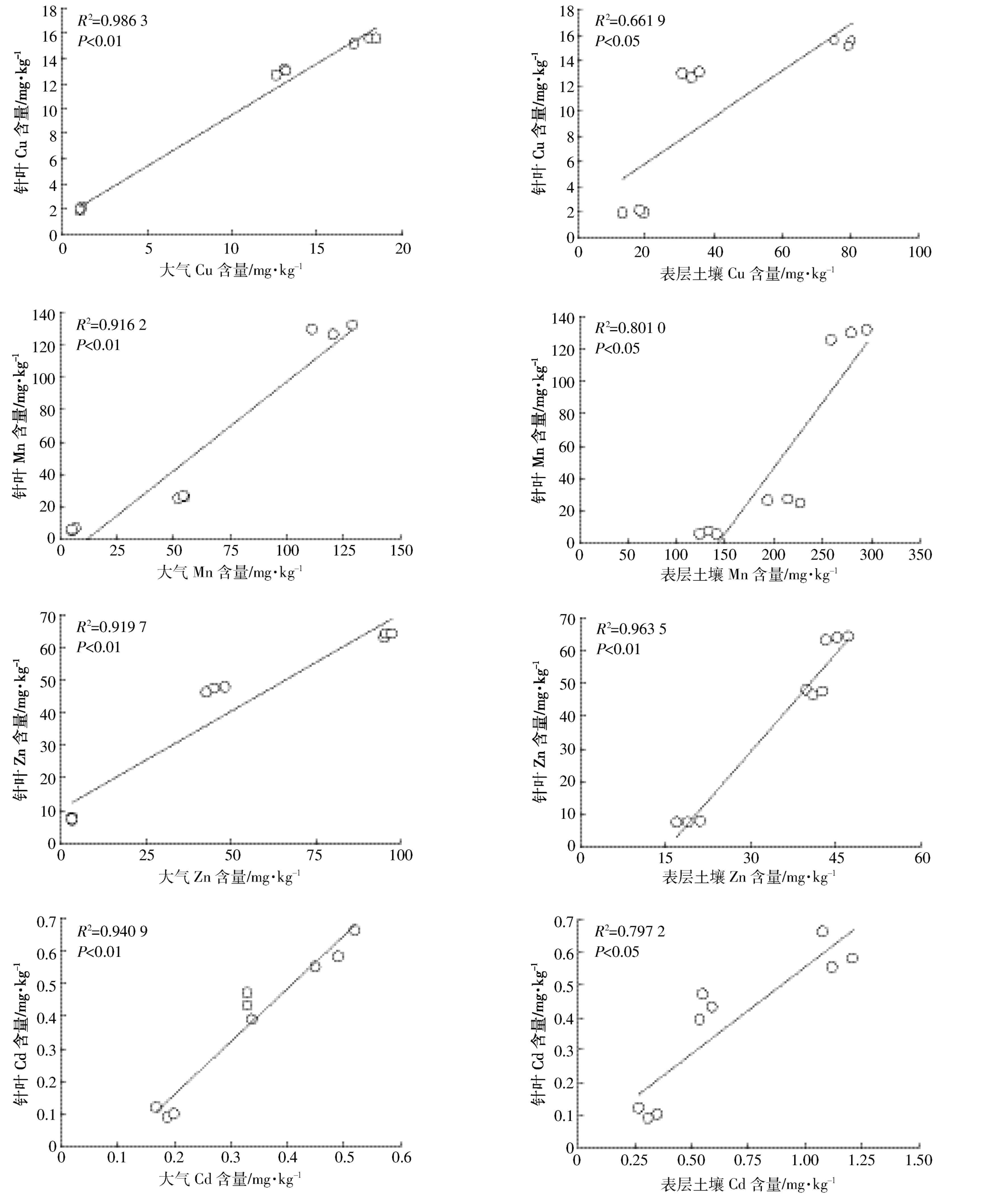 Figure 2 Regression analysis between the contents of heavy metals in needles and atmosphere or topsoil