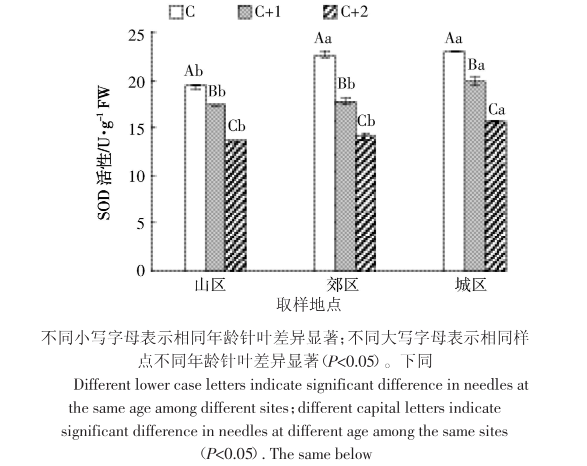 针叶中SOD活性如图3所示,可以看出,相同年龄针叶中SOD活性总体趋势表现为城区>郊区>山区。当年生针叶中SOD活性表现为城区>郊区>山区,郊区和城区分别比山区提高了17%和19%,而城区和郊区二者间差异不显著;二年生针叶中SOD活性,城区显著高于山区和郊区;三年生针叶中SOD活性表现为城区>郊区>山区,城区比山区提高了14%。由图3也可以得知,在相同采样点,不同年龄针叶中SOD活性也存在差异。在城区,随着针叶年龄的增加,二年生和三年生针叶SOD活性分别比当年生针叶降低了14%和32%;在郊区,3种年龄针叶中SOD活性存在显著差异,二年生和三年生针叶分别比当年生针叶下降了22%和38%;在山区,随着针叶年龄的增加,SOD活性逐渐降低。