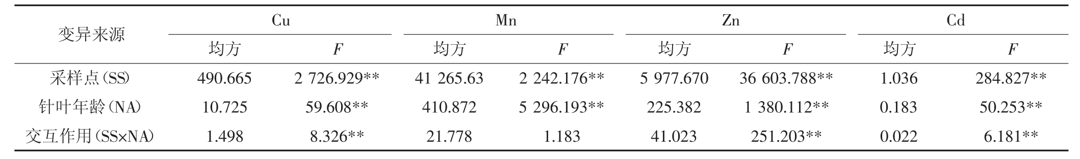 变异来源 Cu Mn Zn Cd均方 F 均方 F 均方 F 均方 F采样点(SS) 490.665 2 726.929** 41 265.63 2 242.176** 5 977.670 36 603.788** 1.036 284.827**针叶年龄(NA) 10.725 59.608** 410.872 5 296.193** 225.382 1 380.112** 0.183 50.253**交互作用(SS×NA) 1.498 8.326** 21.778 1.183 41.023 251.203** 0.022 6.181**