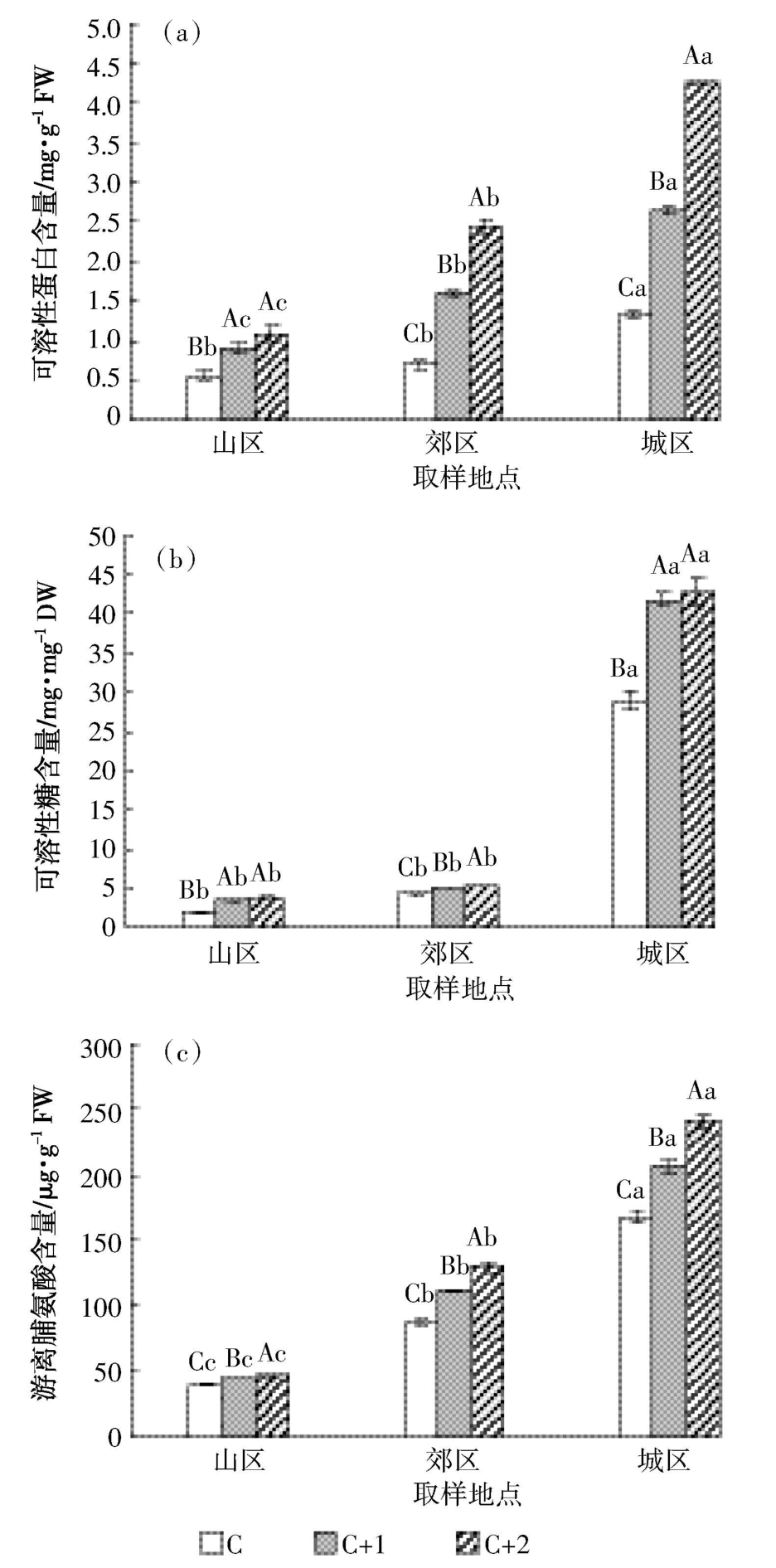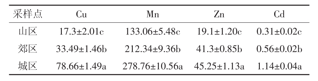 采样点 Cu Mn Zn Cd山区 17.3±2.01c 133.06±5.48c 19.1±1.20c 0.31±0.02c郊区 33.49±1.46b 212.34±9.36b 41.3±0.85b 0.56±0.02b城区 78.66±1.49a 278.76±10.56a 45.25±1.13a 1.14±0.04a