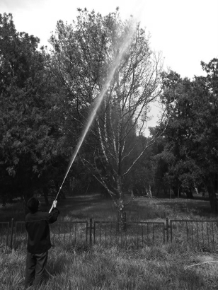 为了避免衰弱白皮松遭受蛀干害虫的危害,加强对蛀干害虫的防治和预防工作。 5月、7月是小蠹成虫的发生期。 由于小蠹类害虫生活隐蔽,防治难度大,化学防治是见效快的方法。 5月到7月使用触破式微胶囊剂绿色威雷对树干和树冠喷300 倍药液。 绿色威雷在自然条件下抗环境降解能力较强,降解较慢,对人低毒。 同时此种农药剂型可提高稳定性,掩蔽气味,减少施用漂移,降低环境污染,在园林景区中使用这种农药剂型对保护环境更具有优势,药效期长在30d以上(见图5)。