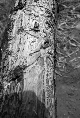 蛀干害虫乘虚而入,在皮下蛀食危害,加剧了白皮松的衰弱死亡。