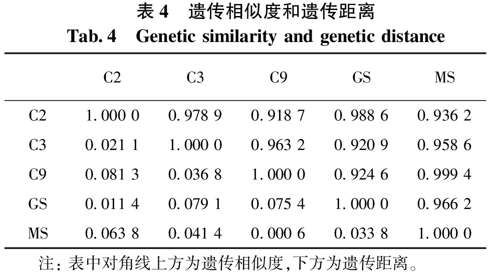 表4 遗传相似度和遗传距离Tab4 GeneticsimilarityandgeneticdistanceC2C3C9GSMSC21000009789091870988609362C30021110000096320920909586C90081300368100000924609994GS0011400791007541000009662MS0063800414000060033810000 注:表中对角线上方为遗传相似度,下方为遗传距离。