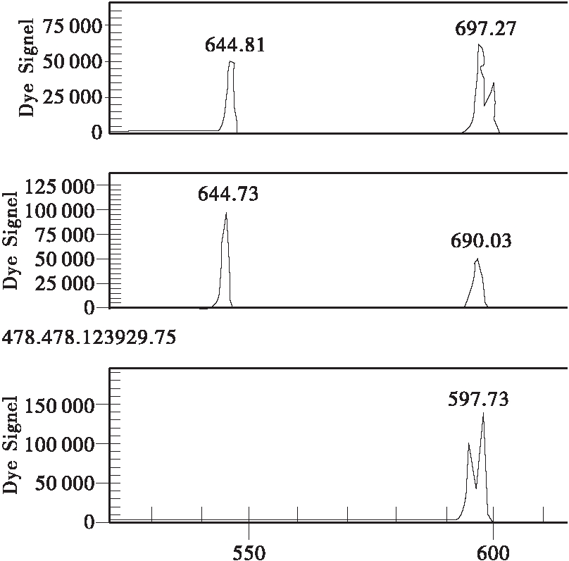 通过BECKMAN CEQ8000将毛细管电泳峰值图按照无峰,有峰的规律自动转换为0,1数据, 再将0,1数据按照每个引物作为1个等位基因位点看待,转换成AA、AB、BB格式的基因型数据。