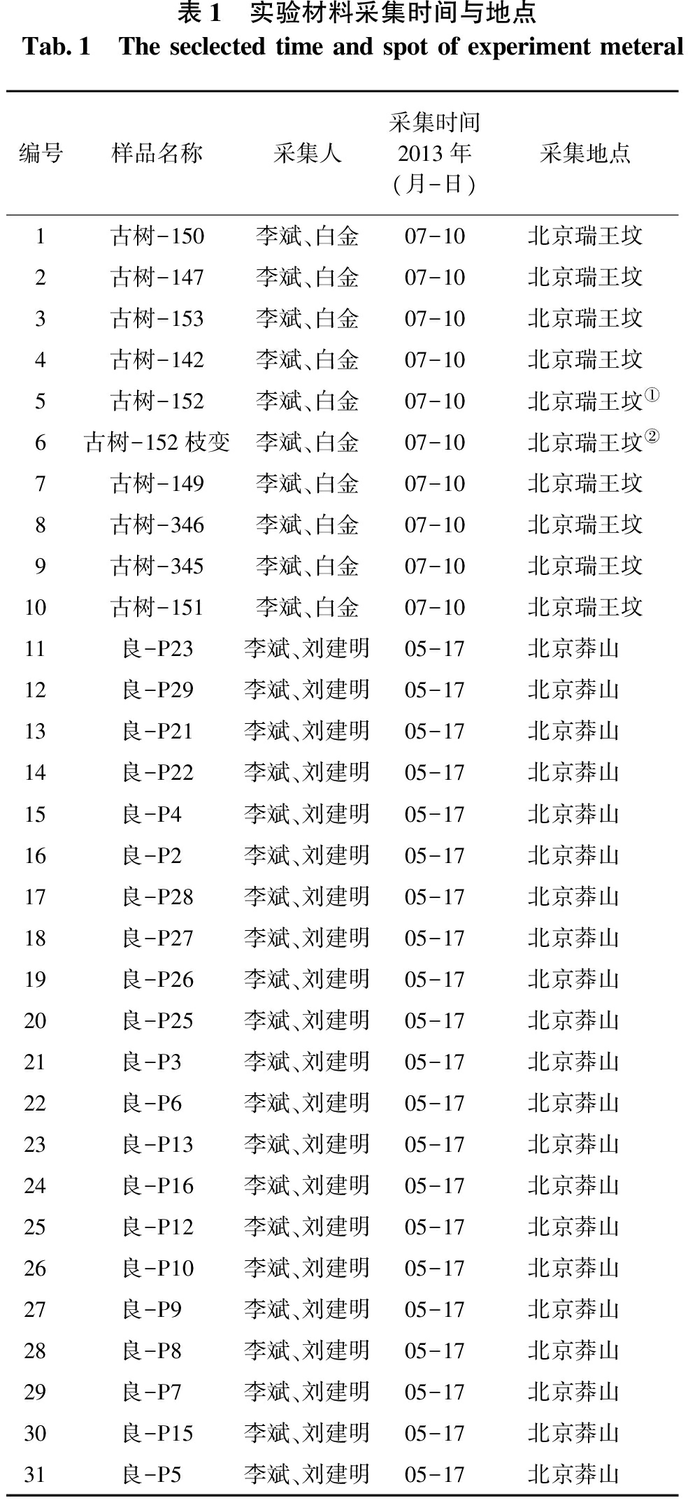 表1 实验材料采集时间与地点Tab1 Theseclectedtimeandspotofexperimentmeteral编号样品名称采集人采集时间2013年(月-日)采集地点1古树-150李斌、白金07-10北京瑞王坟2古树-147李斌、白金07-10北京瑞王坟3古树-153李斌、白金07-10北京瑞王坟4古树-142李斌、白金07-10北京瑞王坟5古树-152李斌、白金07-10北京瑞王坟①6古树-152枝变李斌、白金07-10北京瑞王坟②7古树-149李斌、白金07-10北京瑞王坟8古树-346李斌、白金07-10北京瑞王坟9古树-345李斌、白金07-10北京瑞王坟10古树-151李斌、白金07-10北京瑞王坟11良-P23李斌、刘建明05-17北京莽山12良-P29李斌、刘建明05-17北京莽山13良-P21李斌、刘建明05-17北京莽山14良-P22李斌、刘建明05-17北京莽山15良-P4 李斌、刘建明05-17北京莽山16良-P2 李斌、刘建明05-17北京莽山17良-P28李斌、刘建明05-17北京莽山18良-P27李斌、刘建明05-17北京莽山19良-P26李斌、刘建明05-17北京莽山20良-P25李斌、刘建明05-17北京莽山21良-P3 李斌、刘建明05-17北京莽山22良-P6 李斌、刘建明05-17北京莽山23良-P13李斌、刘建明05-17北京莽山24良-P16李斌、刘建明05-17北京莽山25良-P12李斌、刘建明05-17北京莽山26良-P10李斌、刘建明05-17北京莽山27良-P9 李斌、刘建明05-17北京莽山28良-P8 李斌、刘建明05-17北京莽山29良-P7 李斌、刘建明05-17北京莽山30良-P15李斌、刘建明05-17北京莽山31良-P5 李斌、刘建明05-17北京莽山