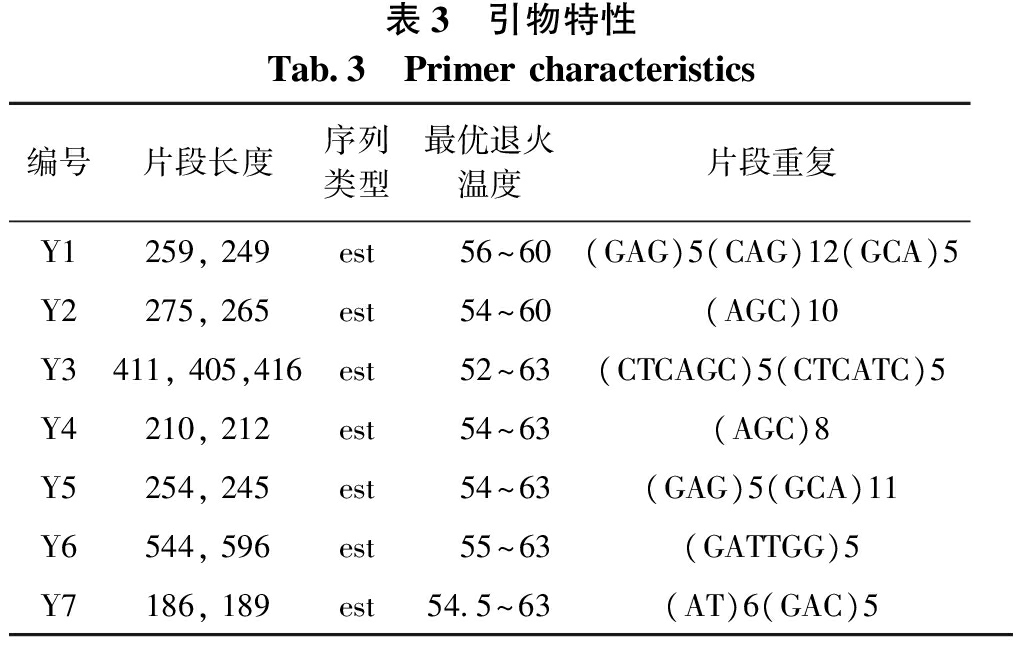 表3 引物特性Tab3 Primercharacteristics编号片段长度序列类型最优退火温度片段重复Y1259,249est 56~60(GAG)5(CAG)12(GCA)5Y2275,265est 54~60(AGC)10Y3411,405,416est 52~63(CTCAGC)5(CTCATC)5Y4210,212est 54~63(AGC)8Y5254,245est 54~63(GAG)5(GCA)11Y6544,596est 55~63(GATTGG)5Y7186,189est545~63(AT)6(GAC)5