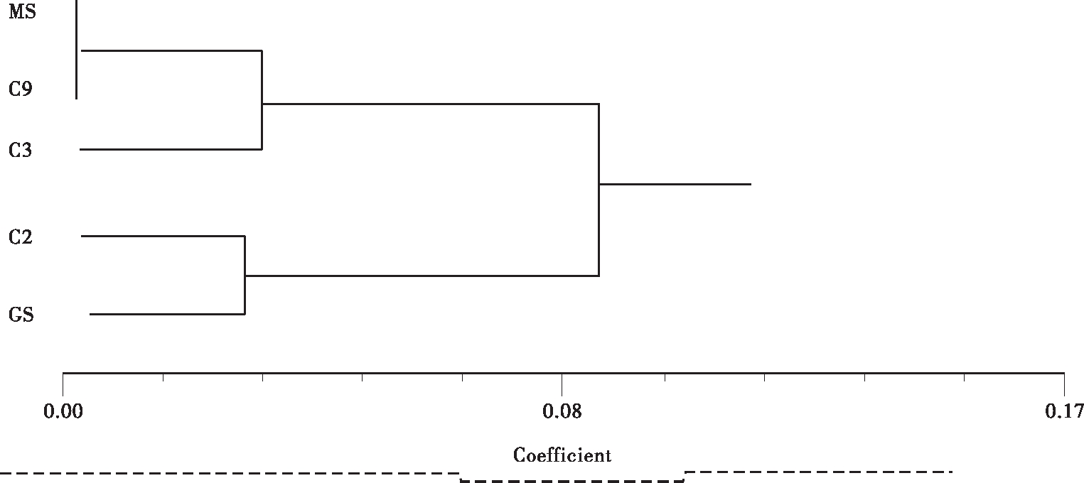 从表4可看出: C2与GS遗传相似度高、遗传距离小,C2与C9组遗传相似度最低、遗传距离最大。C3与C9遗传相似度较高、遗传距离较小,C3与GS组相似度最低,遗传距离最大。这说明C3在遗传进化上与C9较近,而与GS相距最远。C9与MS遗传相似度非常高、遗传距离非常小,C9与GS组相似度最低,遗传距离最大。C9可能存在遗传变异的证据不充分。