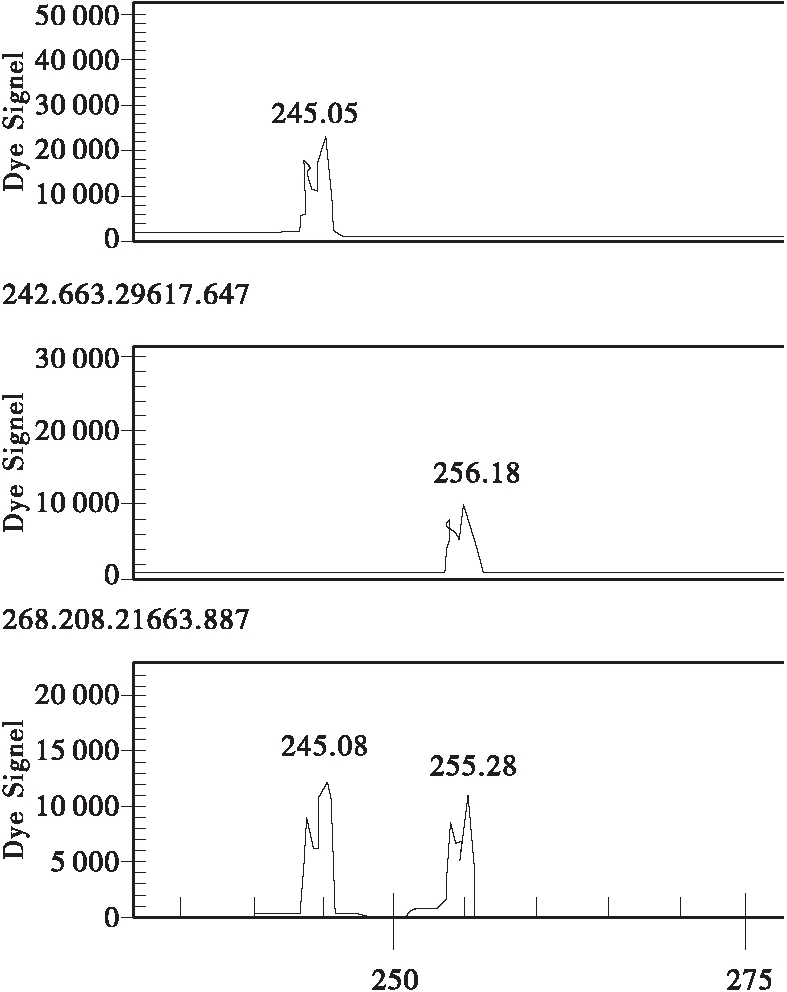 Fig.2 Locus Y2(Top: “ancient tree No.9”; Center: “Penxian bungeana ” clone and its original tree; Bottom: “Ruiwang bungeana” clone and its mother tree stick. The sample of certified seed base as same as top and bottom)