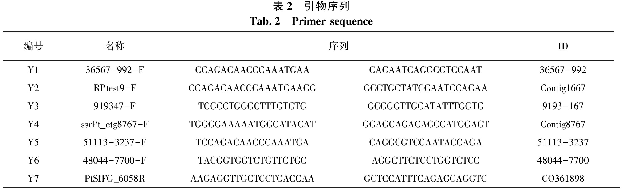 表2 引物序列Tab2 Primersequence编号名称序列IDY136567-992-FCCAGACAACCCAAATGAACAGAATCAGGCGTCCAAT36567-992Y2RPtest9-FCCAGACAACCCAAATGAAGGGCCTGCTATCGAATCCAGAAContig1667Y3919347-FTCGCCTGGGCTTTGTCTGGCGGGTTGCATATTTGGTG9193-167Y4ssrPt_ctg8767-FTGGGGAAAAATGGCATACATGGAGCAGACACCCATGGACTContig8767Y551113-3237-FTCCAGACAACCCAAATGACAGGCGTCCAATACCAGA51113-3237Y648044-7700-FTACGGTGGTCTGTTCTGCAGGCTTCTCCTGGTCTCC48044-7700Y7PtSIFG_6058RAAGAGGTTGCTCCTCACCAAGCTCCATTTCAGAGCAGGTCCO361898