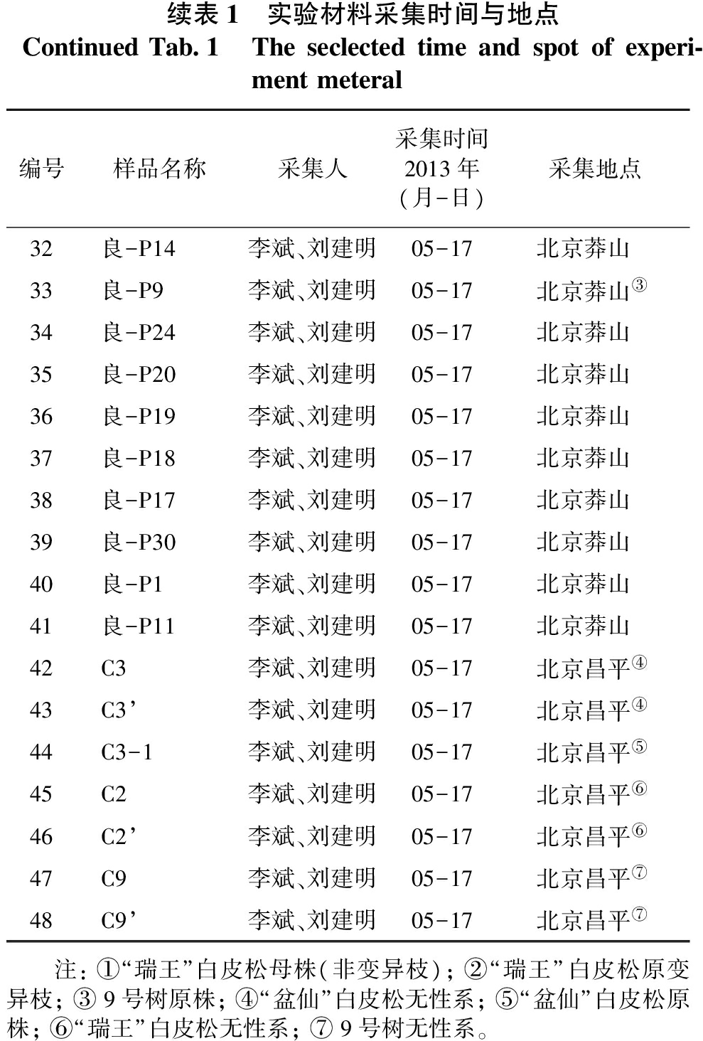 续表1 实验材料采集时间与地点ContinuedTab1 Theseclectedtimeandspotofexperi⁃mentmeteral编号样品名称采集人采集时间2013年(月-日)采集地点32良-P14李斌、刘建明05-17北京莽山33良-P9 李斌、刘建明05-17北京莽山③34良-P24李斌、刘建明05-17北京莽山35良-P20李斌、刘建明05-17北京莽山36良-P19李斌、刘建明05-17北京莽山37良-P18李斌、刘建明05-17北京莽山38良-P17李斌、刘建明05-17北京莽山39良-P30李斌、刘建明05-17北京莽山40良-P1 李斌、刘建明05-17北京莽山41良-P11李斌、刘建明05-17北京莽山42C3 李斌、刘建明05-17北京昌平④43C3’ 李斌、刘建明05-17北京昌平④44C3-1 李斌、刘建明05-17北京昌平⑤45C2 李斌、刘建明05-17北京昌平⑥46C2’ 李斌、刘建明05-17北京昌平⑥47C9 李斌、刘建明05-17北京昌平⑦48C9’ 李斌、刘建明05-17北京昌平⑦ 注:①“瑞王”白皮松母株(非变异枝);②“瑞王”白皮松原变异枝;③9号树原株;④“盆仙”白皮松无性系;⑤“盆仙”白皮松原株;⑥“瑞王”白皮松无性系;⑦9号树无性系。
