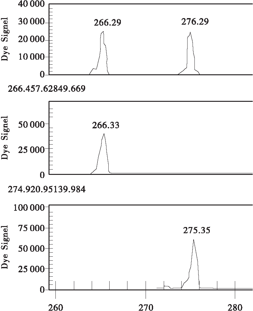 Fig.3 Locus Y6(Top: “ancient tree No.9”; Center: “Penxian bungeana ” clone and its original tree; Bottom: “Ruiwang bungeana” clone and its mother tree stick. The samples of certified seed base as same as top and center)