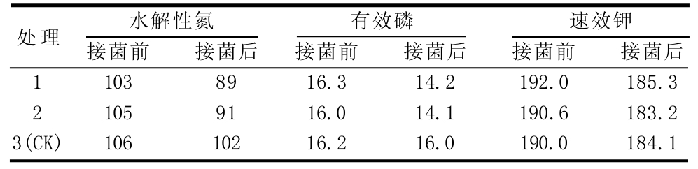 水解性氮处理 有效磷 速效钾1 2 3(CK)接菌前103 105 106接菌后89 91 102接菌前16.3 16.0 16.2接菌后14.2 14.1 16.0接菌前192.0 190.6 190.0接菌后185.3 183.2 184.1