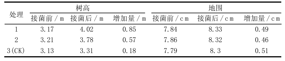 处理 树高 地围12 3(CK)接菌前/m 3.17 3.21 3.13接菌后/m 4.02 3.78 3.31增加量/m 0.85 0.57 0.18接菌前/cm 7.84 7.86 7.79接菌后/cm 8.33 8.32 8.3增加量/cm 0.49 0.46 0.51