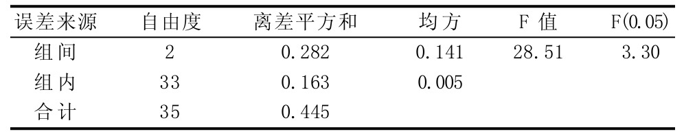 误差来源组间组内合计自由度2 33 35离差平方和0.282 0.163 0.445均方0.141 0.005 F值28.51 F(0.05) 3.30