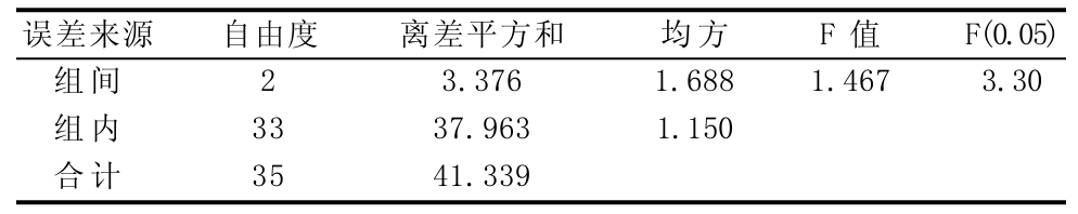 误差来源组间组内合计自由度2 33 35离差平方和3.376 37.963 41.339均方1.688 1.150 F值1.467 F(0.05) 3.30