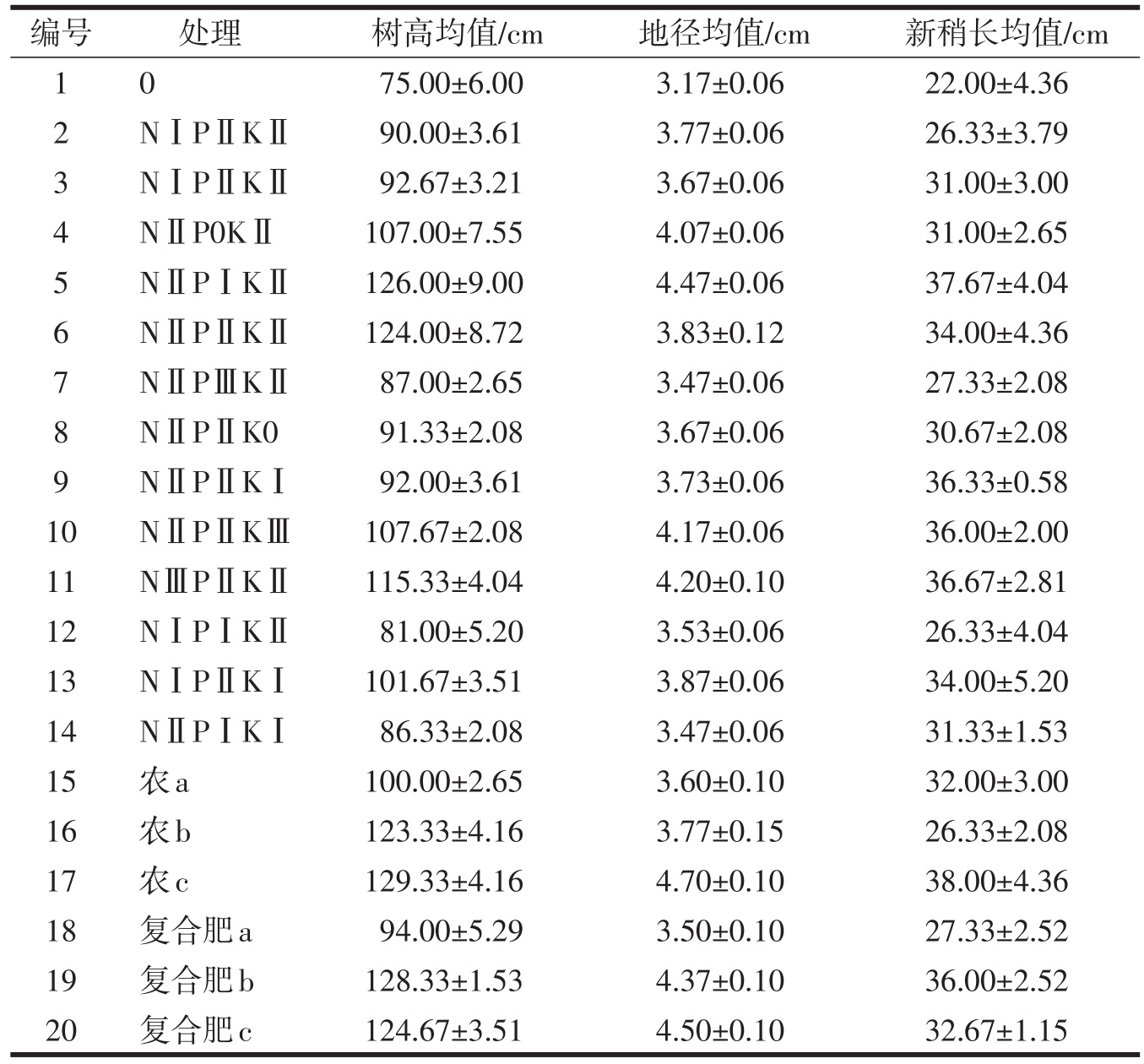 上述试验结果表明树高、地径、新稍生长量在不同处理间均存在显著性差异。处理5,6,16,17,19,20的树高明显大于1,7,12处理的,处理5,17,19,20的地径明显大于处理1的,处理5,17、19的新稍生长量明显高于处理1,2,7,18的。处理5,17和19即经过NⅡPⅠKⅡ、农家肥c、复合肥b处理的白皮松其树高、地径和新稍生长量均高于其他处理的。见表3。
