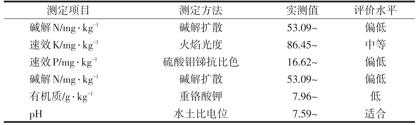 测定项目碱解N∕mg⋅kg-1速效K∕mg⋅kg-1速效P∕mg⋅kg-1碱解N∕mg⋅kg-1有机质∕g⋅kg-1 pH测定方法碱解扩散火焰光度硫酸钼锑抗比色碱解扩散重铬酸钾水土比电位实测值53.09~86.45~16.62~53.09~7.96~7.59~评价水平偏低中等偏低偏低低适合