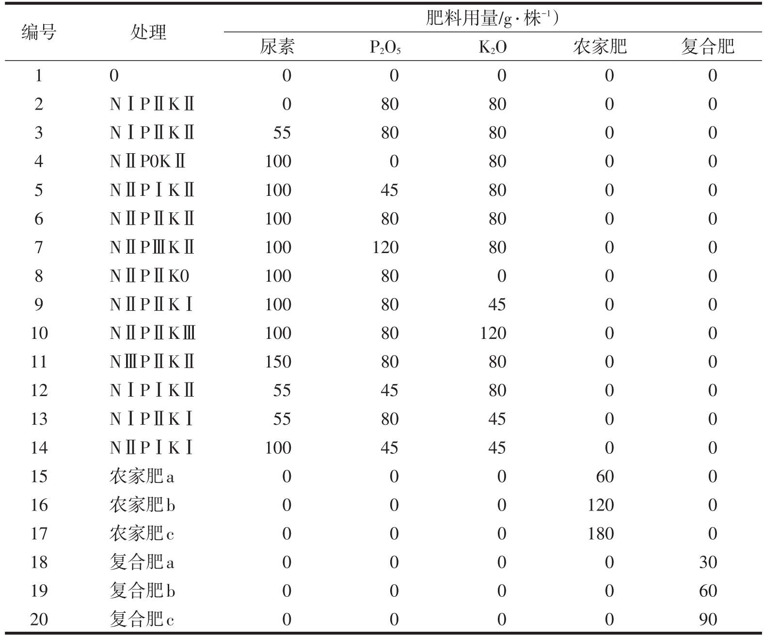 编号K2肥料用量∕g⋅株-1)尿素 农家肥 复合肥1234567891 0 005 5 O08 0 11 12 13 14 15 16 17 18 19 20处理0 NⅠPⅡKⅡNⅠPⅡKⅡNⅡP0KⅡNⅡPⅠKⅡNⅡPⅡKⅡNⅡPⅢKⅡNⅡPⅡK0 NⅡPⅡKⅠNⅡPⅡKⅢNⅢPⅡKⅡNⅠPⅠKⅡNⅠPⅡKⅠNⅡPⅠKⅠ农家肥a农家肥b农家肥c复合肥a复合肥b复合肥c 100 100 100 100 100 100 100 150 55 55 100 P2O508 0 80 0 45 80 120 80 80 80 80 45 80 45 80 80 80 80 80 0 45 120 80 80 45 45 000000 000000 000000 000000000000006 0 120 180 000 000000000000000003 0 60 90