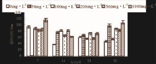 重金属处理,镉的设计含量为0(对照)、50 mg·L-1、100 mg·L-1、200 mg·L-1、500 mg·L-1、1 000 mg·L-1(以纯Cd2+计算),共11个处理,每处理3盆,以不加重金属的处理为对照。分别在处理后的7 d、14 d、21 d和28 d采样,每次从每盆中取1颗苗的针叶进行电阻抗测定。