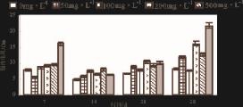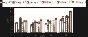 从图1可见,时间为7 d时,胞外电阻随胁迫浓度的增加,在50 mg·L-1减小外,在其余浓度都较对照增加。在其余胁迫时间,胞外电阻的增加并不明显。分析表明,Cd2+浓度为 200 mg·L-1,500 mg·L-1处理的白皮松叶的胞外电阻与对照差异显著,并且高于对照,Cd2+浓度为1 000 mg·L-1的白皮松叶的胞外电阻与对照差异极显著,在此浓度的值也高于对照(表1~表4和图1)。