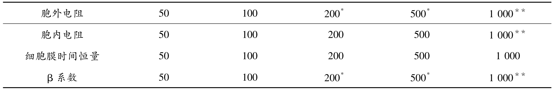 胞外电阻 50 100 200*500*1 000**胞内电阻 50 100 200 500 1 000**细胞膜时间恒量 50 100 200 500 1 000β系数 50 100 200*500*1 000**