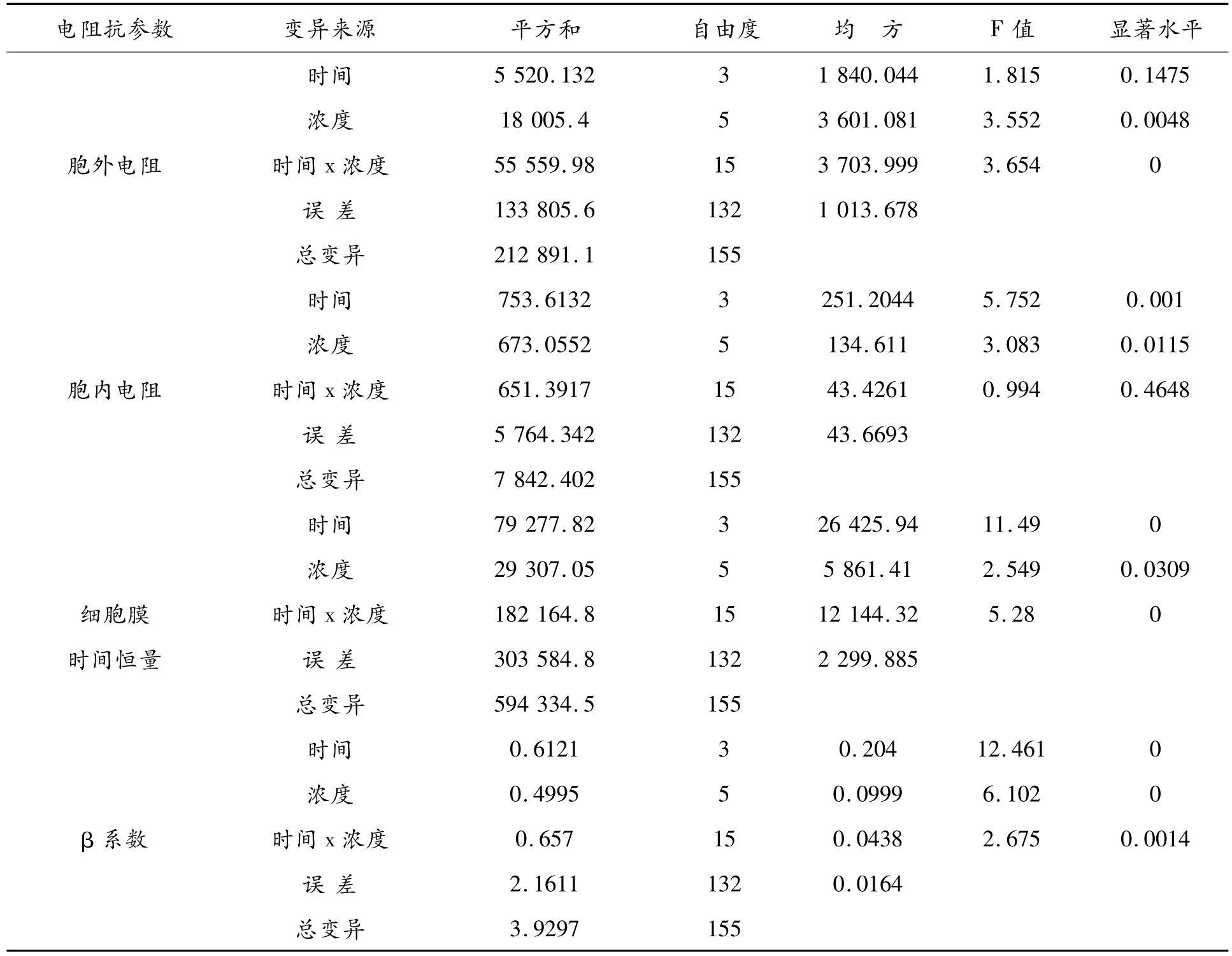 电阻抗参数 变异来源 平方和 自由度 均 方 F 5 520.132 3 1 840.044 1.815 0.1475浓度 18 005.4 5 3 601.081 3.552 0.0048胞外电阻 时间x浓度 55 559.98 15 3 703.999 3.654 0误差 133 805.6 132 1 013.678总变异 212 891.1 155时间 753.6132 3 251.2044 5.752 0.001浓度 673.0552 5 134.611 3.083 0.0115胞内电阻 时间x浓度 651.3917 15 43.4261 0.994 0.4648误差 5 764.342 132 43.6693总变异 7 842.402 155时间 79 277.82 3 26 425.94 11.49 0浓度 29 307.05 5 5 861.41 2.549 0.0309细胞膜 时间x浓度 182 164.8 15 12 144.32 5.28 0时间恒量 误差 303 584.8 132 2 299.885总变异 594 334.5 155时间 0.6121 3 0.204 12.461 0浓度 0.4995 5 0.0999 6.102 0β系数 时间x浓度 0.657 15 0.0438 2.675 0.0014误差 2.1611 132 0.0164总变异值 显著水平时间3.9297 155