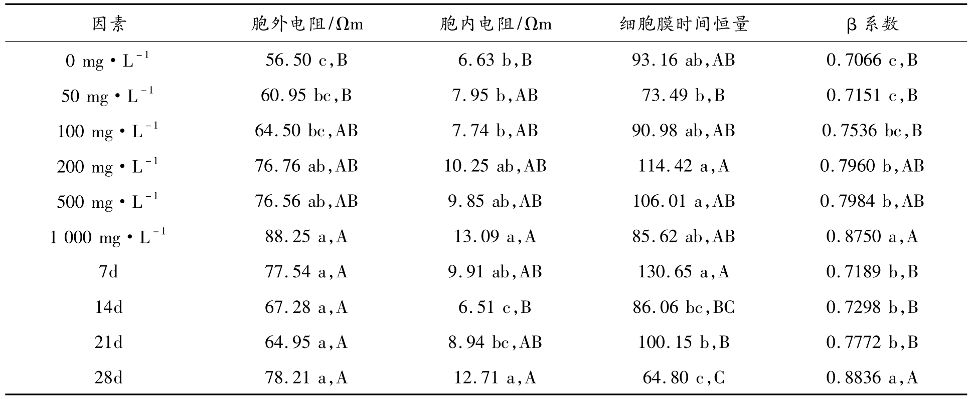 系数0 mg·L-156.50 c,B 6.63 b,B 93.16 ab,AB 0.7066 c,因素 胞外电阻/Ωm 胞内电阻/Ωm 细胞膜时间恒量 β B 50 mg·L-160.95 bc,B 7.95 b,AB 73.49 b,B 0.7151 c,B 100 mg·L-164.50 bc,AB 7.74 b,AB 90.98 ab,AB 0.7536 bc,B 200 mg·L-176.76 ab,AB 10.25 ab,AB 114.42 a,A 0.7960 b,AB 500 mg·L-176.56 ab,AB 9.85 ab,AB 106.01 a,AB 0.7984 b,AB 1 000 mg·L-188.25 a,A 13.09 a,A 85.62 ab,AB 0.8750 a,A 7d 77.54 a,A 9.91 ab,AB 130.65 a,A 0.7189 b,B 14d 67.28 a,A 6.51 c,B 86.06 bc,BC 0.7298 b,B 21d 64.95 a,A 8.94 bc,AB 100.15 b,B 0.7772 b,B 28d 78.21 a,A 12.71 a,A 64.80 c,C 0.8836 a,A