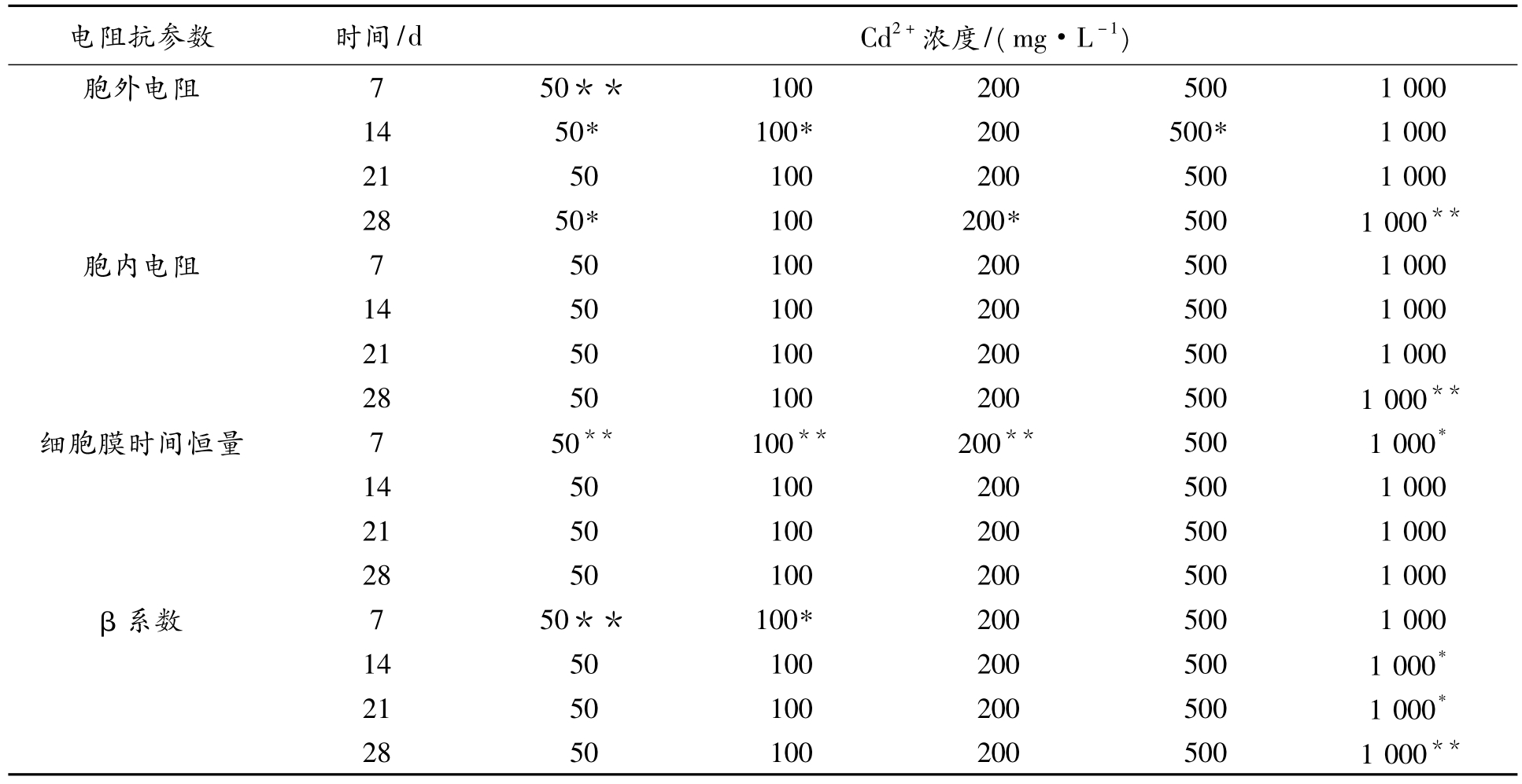 电阻抗参数 时间/d Cd2+浓度/(mg·L-1) 100 200 500 1 000 14 50* 100* 200 500* 1 000 21 50 100 200 500 1 000 28 50* 100 200* 500 1 000**胞内电阻 7 50 100 200 500 1 000 14 50 100 200 500 1 000 21 50 100 200 500 1 000 28 50 100 200 500 1 000**细胞膜时间恒量 7 50**100**200**500 1 000*14 50 100 200 500 1 000 21 50 100 200 500 1 000 28 50 100 200 500 1 000β系数 7 50** 100* 200 500 1 000 14 50 100 200 500 1 000*21 50 100 200 500 1 000*28 50 100 200 500 1 000胞外电阻 7 50****