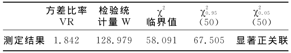 方差比率VR检验统计量W χ2临界值χ2 0.95(50) χ20.05(50)测定结果1.842 128.979 58.091 67.505显著正关联
