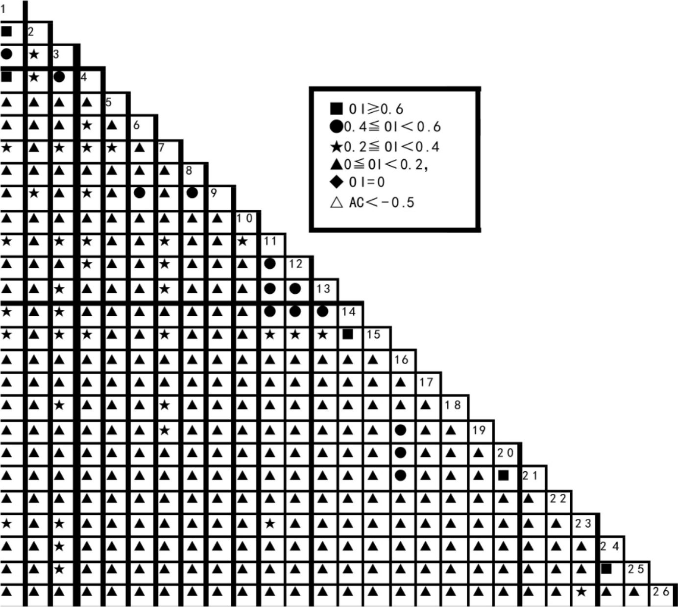 Fig.3 Half-matrix of Ochiai′s coefficient of interspecific connecion among the 26main arobrs