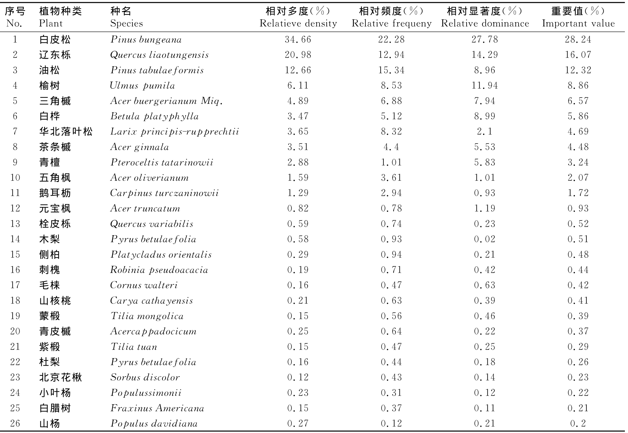 序号No.植物种类Plant种名Species相对多度(%)Relatieve density相对频度(%)Relative frequeny相对显著度(%)Relative dominance重要值(%)Important value 1 白皮松 Pinusbungeana 34.66 22.28 27.78 28.24 2 辽东栎 Quercusliaotungensis 20.98 12.94 14.29 16.07 3 油松 Pinustabulaeformis 12.66 15.34 8.96 12.32 4 榆树 Ulmuspumila 6.11 8.53 11.94 8.86 5 三角槭 AcerbuergerianumMiq. 4.89 6.88 7.94 6.57 6 白桦 Betulaplatyphylla 3.47 5.12 8.99 5.86 7 华北落叶松 Larixprincipis-rupprechtii 3.65 8.32 2.1 4.69 8 茶条槭 Acerginnala 3.51 4.4 5.53 4.48 9 青檀 Pteroceltistatarinowii 2.88 1.01 5.83 3.24 10 五角枫 Aceroliverianum 1.59 3.61 1.01 2.07 11 鹅耳枥 Carpinusturczaninowii 1.29 2.94 0.93 1.72 12 元宝枫 Acertruncatum 0.82 0.78 1.19 0.93 13 栓皮栎 Quercusvariabilis 0.59 0.74 0.23 0.52 14 木梨 Pyrusbetulaefolia 0.58 0.93 0.02 0.51 15 侧柏 Platycladusorientalis 0.29 0.94 0.21 0.48 16 刺槐 Robiniapseudoacacia 0.19 0.71 0.42 0.44 17 毛梾 Cornuswalteri 0.16 0.47 0.63 0.42 18 山核桃 Caryacathayensis 0.21 0.63 0.39 0.41 19 蒙椴 Tiliamongolica 0.15 0.56 0.46 0.39 20 青皮槭 Acercappadocicum 0.25 0.64 0.22 0.37 21 紫椴 Tiliatuan 0.15 0.47 0.25 0.29 22 杜梨 Pyrusbetulaefolia 0.16 0.44 0.18 0.26 23 北京花楸 Sorbusdiscolor 0.12 0.43 0.14 0.23 24 小叶杨 Populussimonii 0.23 0.31 0.12 0.22 25 白腊树 FraxinusAmericana 0.15 0.37 0.11 0.21 26 山杨 Populusdavidiana 0.27 0.12 0.21 0.2