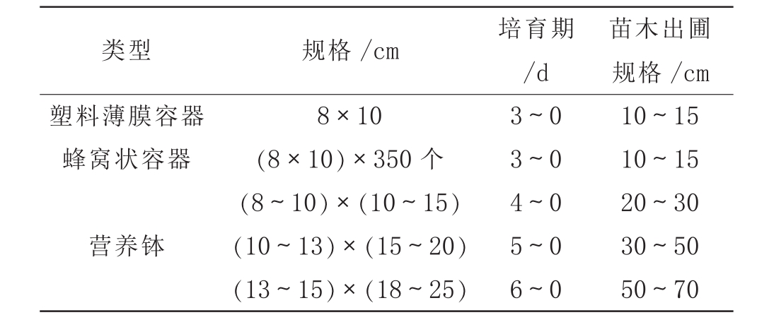 育苗容器规格取决于育苗地区的立地条件、苗木培育期限、苗木计划培育规格等。主要根据所培育苗木的培育期、出圃规格来确定育苗容器的规格。常用容器规格见表1。