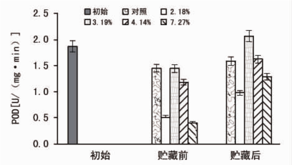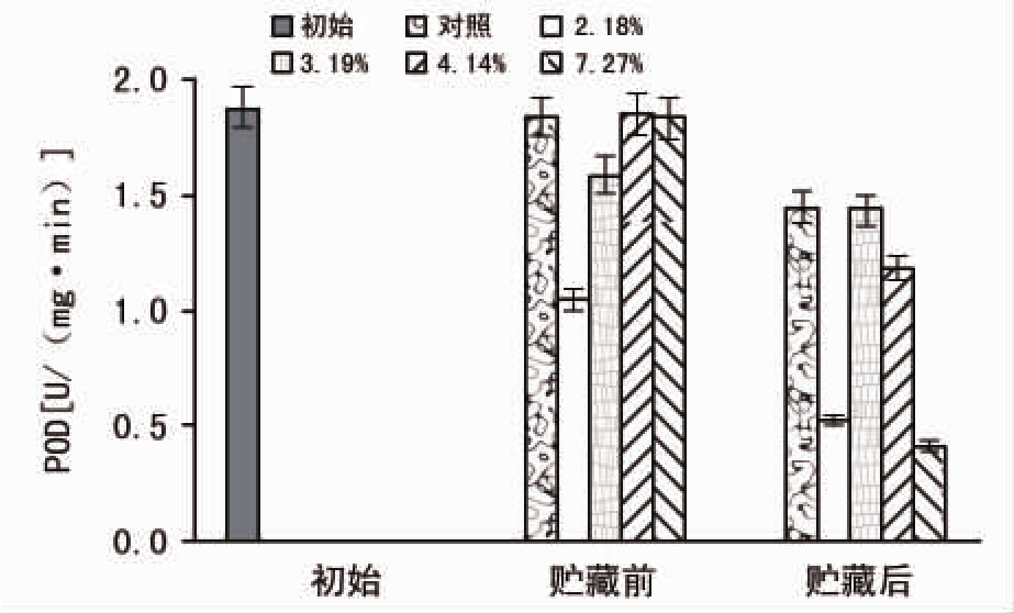 对贮藏前后的各种子的过氧化物酶(POD)、超氧化物歧化酶(SOD)及过氧化氢酶(CAT)活性进行测定,结果如图4~6所示。