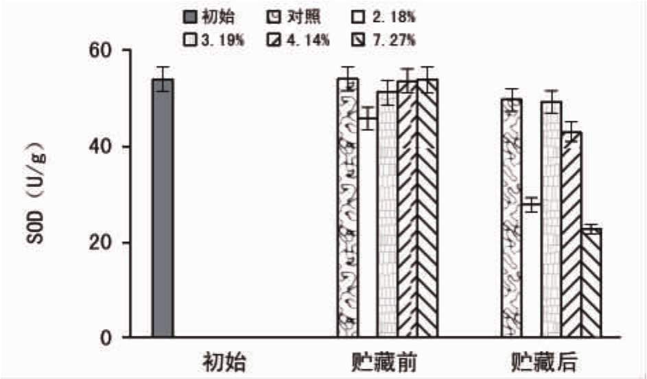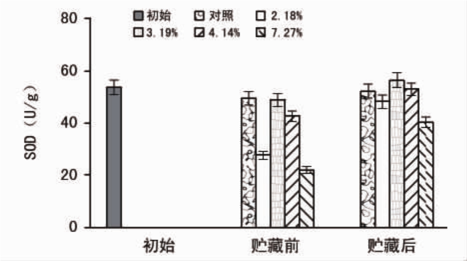 从结果可以看出,贮藏后的各含水量种子MDA含量与贮藏前相比,都有所增加,但含水量为3.19%的种子增幅最小,仅为8.21%,而7.27%的种子增幅最大,达到45.57%。这表明含水量为3.19%的种子在贮藏中脂质过氧化作用的发生程度最轻,表现出最强的抗脂质过氧化性。