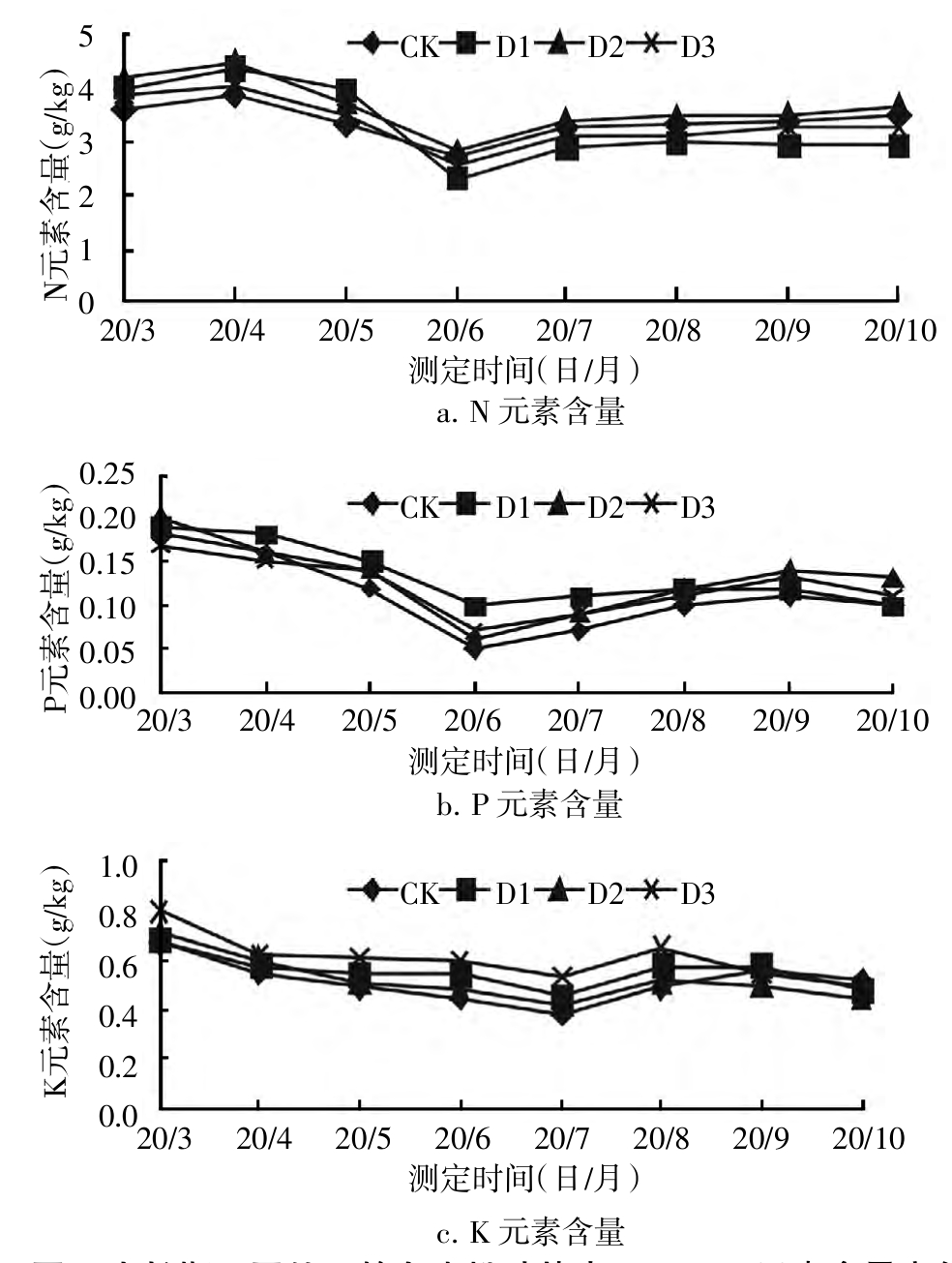 测定结果表明,随着施肥次数和施肥量的增加以及生育进程的推移,各处理白皮松生长期叶片N、P、K元素含量总体呈S型变化趋势,但存在一定差异。从图1可以看出,各处理的N元素含量自3月20日至4月20日均呈上升趋势,4月20日后至6月20日均呈下降趋势,6月20日后至10月20日除处理D1自8月20日至10月20日、CK自9月20日至10月20日保持不变外,处理D2、处理D3均呈缓慢上升趋势;P元素含量3月20日至6月20日均呈下降趋势,6月20日后至10月20日均呈先升后降趋势;K元素含量3月20日至7月20日均呈下降趋势,7月20日后至10月20日均呈先升后降趋势。这可能是由于3月中下旬新梢开始生长,叶片内N、P、K元素向新梢转移,树木吸收了大量养分用于叶片的营养生长。6月20日至8月20日叶片逐渐成熟,光合作用增强,叶片积累了大量有机物,同时由于蒸腾作用增强,叶片从土壤中吸收大量N、P、K元素,形成了不同处理自6月20日至8月20日叶片内N、P、K元素吸收量缓慢上升的趋势。