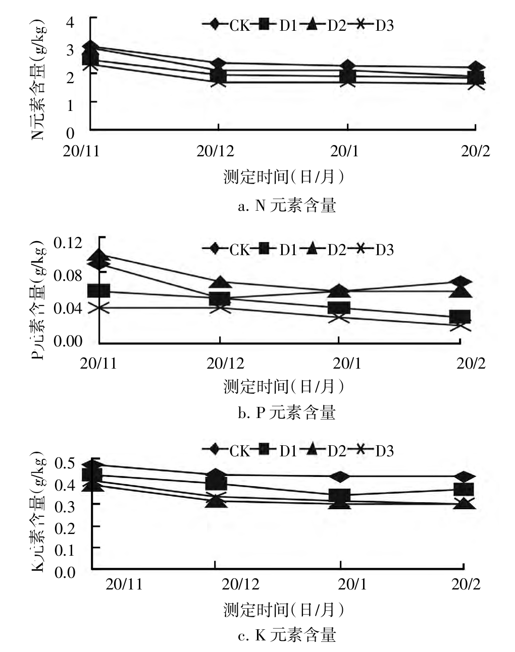 10月下旬至翌年2月下旬,白皮松进入休眠期后,不同施肥处理白皮松叶片内N、P、K元素含量的变化总体呈下降趋势。从图2可以看出,各处理的N元素含量11月20日至12月20日均呈下降趋势,12月20日后至翌年2月20日除处理D2自翌年1月20日至2月20日呈下降趋势外,其余处理基本保持不变;P元素含量除CK呈先降后升趋势外,其余处理均呈下降趋势;K元素含量除处理D1呈先降后升趋势外,其余处理均呈缓慢下降趋势。由于10月下旬树体进入休眠期后,光合作用减弱,养分消耗量减少,致使叶片中N、P、K元素逐渐积累而增加,但根系仍保持一定的养分吸收速率。晚秋叶片回流N、P、K元素对树体贮藏营养元素的作用十分重要,进入N素营养储备期,此时叶片中的N元素逐渐向树体及根部回流[5]。