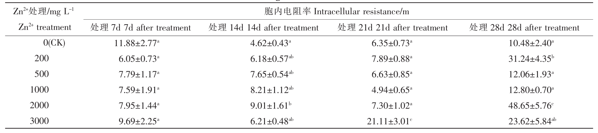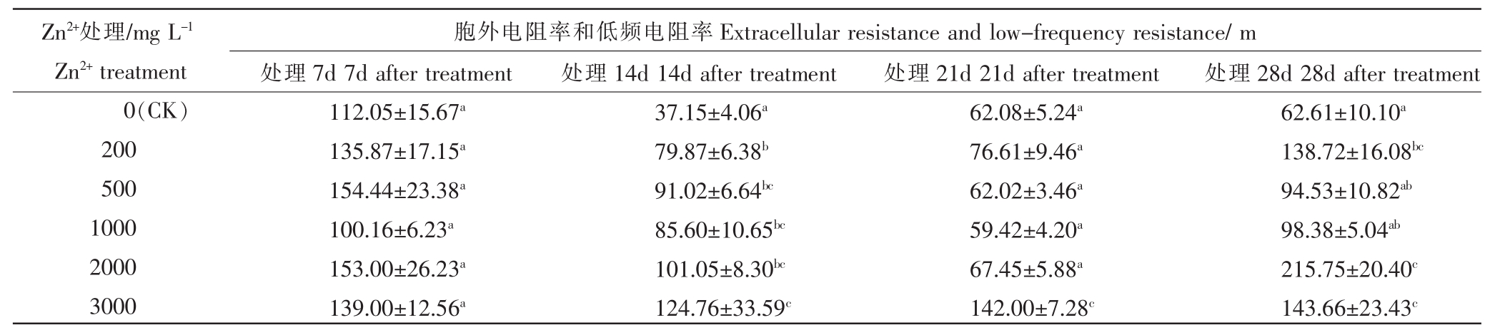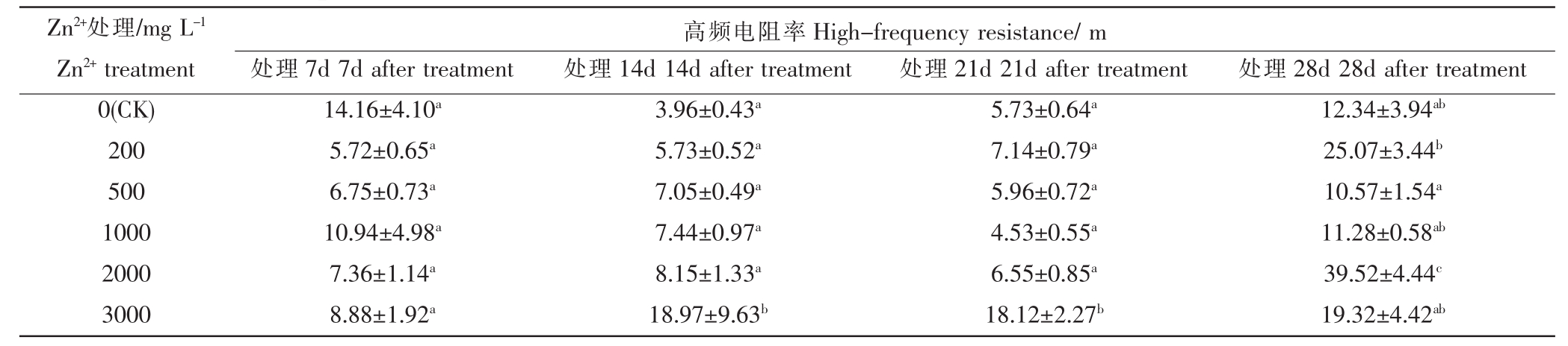 Zn2+处理/mg L-1 Zn2+treatment 0(CK)200 500 1000 2000 3000胞外电阻率和低频电阻率Extracellular resistance and low-frequency resistance/m处理7d 7d after treatment 112.05±15.67a 135.87±17.15a 154.44±23.38a 100.16±6.23a 153.00±26.23a 139.00±12.56a处理14d 14d after treatment 37.15±4.06a 79.87±6.38b 91.02±6.64bc 85.60±10.65bc 101.05±8.30bc 124.76±33.59c处理21d 21d after treatment 62.08±5.24a 76.61±9.46a 62.02±3.46a 59.42±4.20a 67.45±5.88a 142.00±7.28c处理28d 28d after treatment 62.61±10.10a 138.72±16.08bc 94.53±10.82ab 98.38±5.04ab 215.75±20.40c 143.66±23.43c