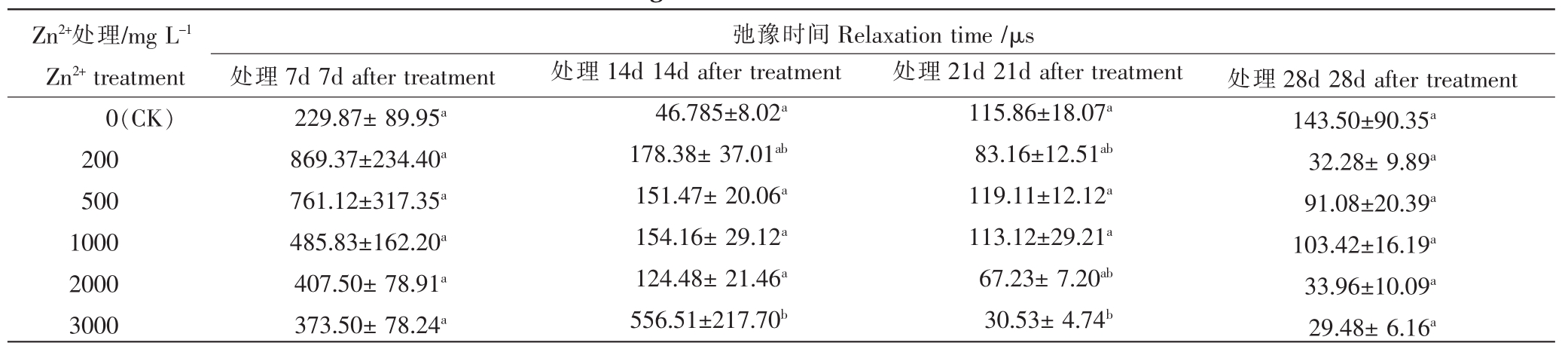 Zn2+处理/mg L-1 Zn2+treatment 0(CK)200 500 1000 2000 3000处理7d 7d after treatment 229.87±89.95a 869.37±234.40a 761.12±317.35a 485.83±162.20a 407.50±78.91a 373.50±78.24a弛豫时间Relaxation time/μs处理14d 14d after treatment 46.785±8.02a 178.38±37.01ab 151.47±20.06a 154.16±29.12a 124.48±21.46a 556.51±217.70b处理21d 21d after treatment 115.86±18.07a 83.16±12.51ab 119.11±12.12a 113.12±29.21a 67.23±7.20ab 30.53±4.74b处理28d 28d after treatment 143.50±90.35a 32.28±9.89a 91.08±20.39a 103.42±16.19a 33.96±10.09a 29.48±6.16a