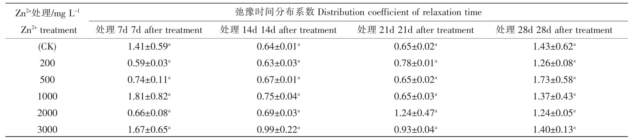 Zn2+处理/mg L-1 Zn2+treatment(CK)200 500 1000 2000 3000弛豫时间分布系数Distribution coefficient of relaxation time处理7d 7d after treatment 1.41±0.59a 0.59±0.03a 0.74±0.11a 1.81±0.82a 0.66±0.08a 1.67±0.65a处理14d 14d after treatment 0.64±0.01a 0.63±0.03a 0.67±0.01a 0.75±0.04a 0.69±0.03a 0.99±0.22a处理21d 21d after treatment 0.65±0.02a 0.78±0.01a 0.65±0.02a 0.65±0.03a 1.24±0.47a 0.93±0.04a处理28d 28d after treatment 1.43±0.62a 1.26±0.08a 1.73±0.58a 1.37±0.43a 1.24±0.05a 1.40±0.13a
