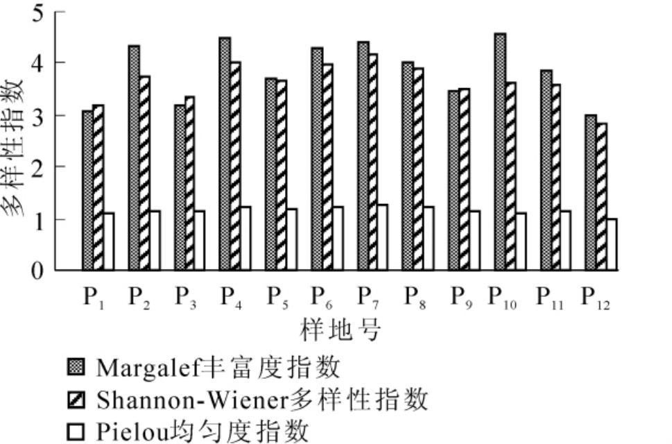 其中:S是样地内出现的物种数,N为全部种的个体数,Pi为第i个种占总数的比例,ni为第i个种的个体数。