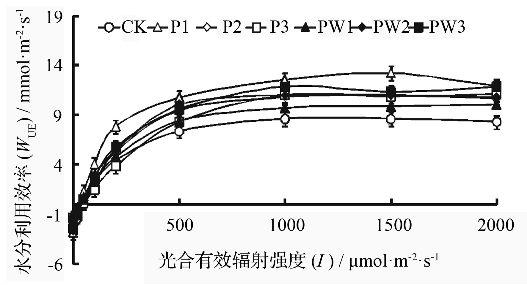 图5 不同处理下水分利用效率(WUE)的光响应曲线