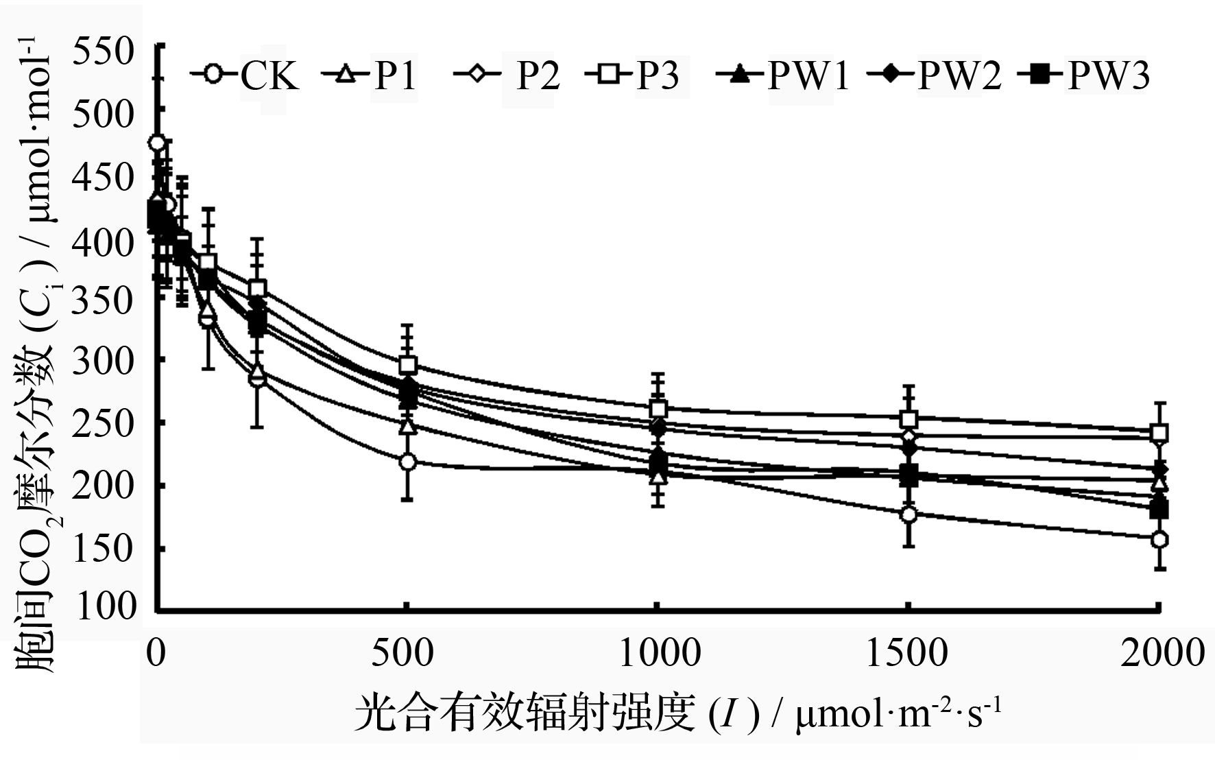 图3 胞间CO2摩尔分数(Ci)的光响应曲线