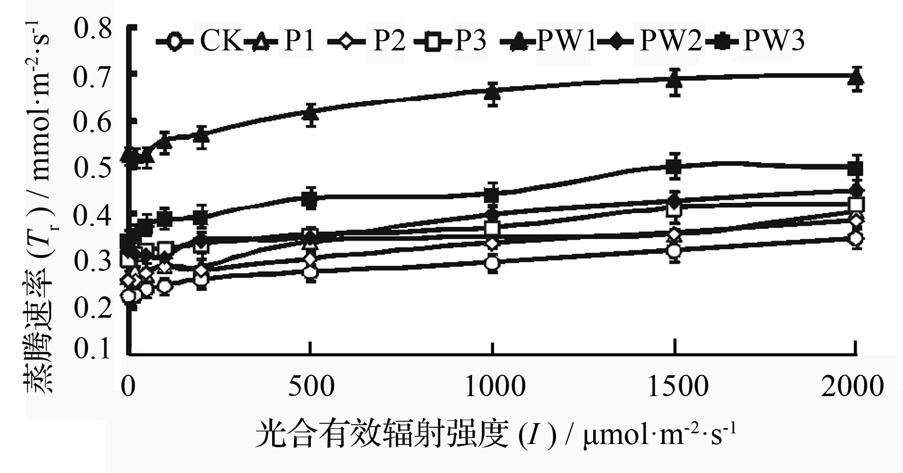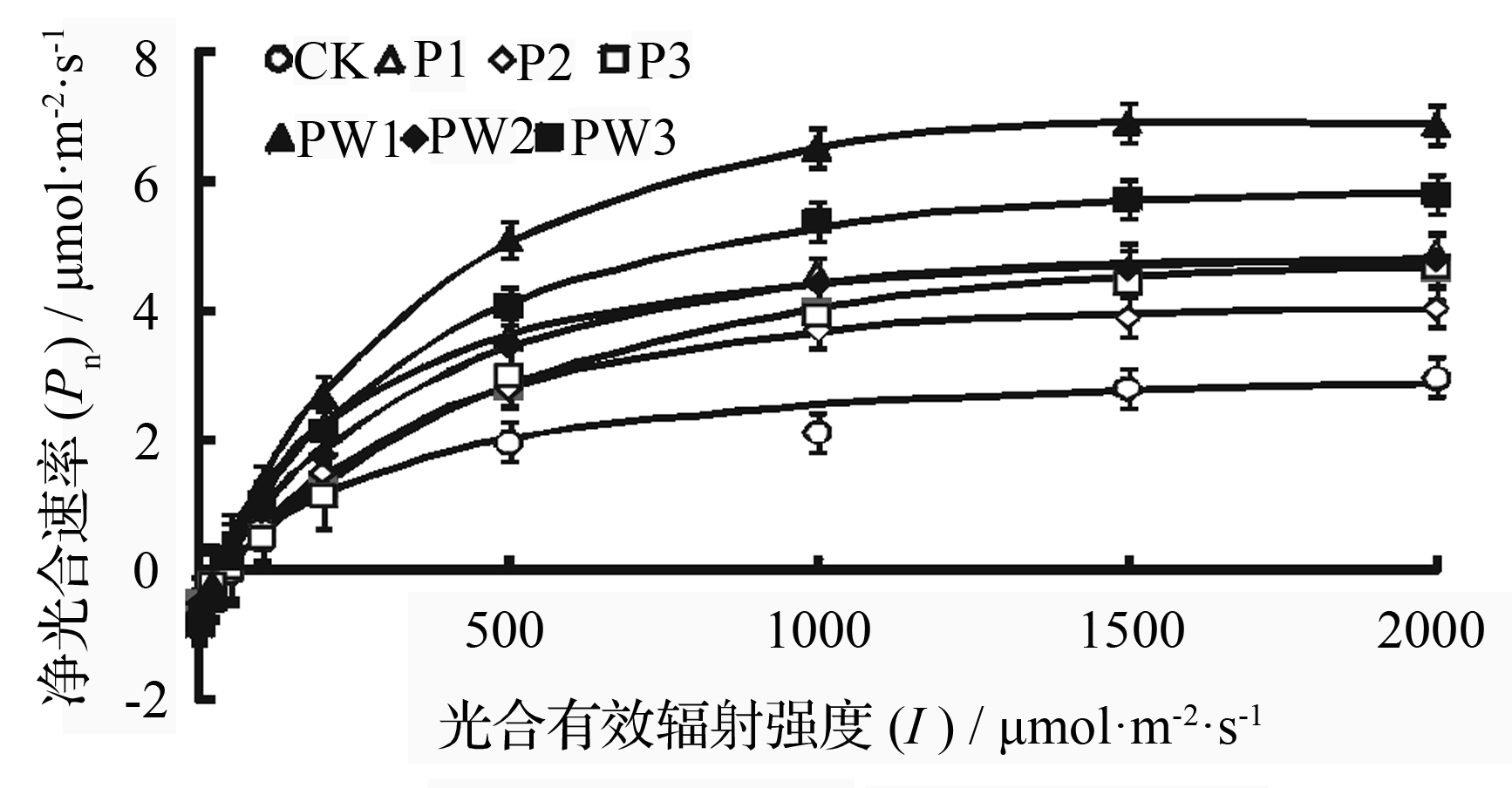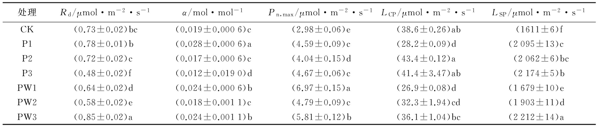 处理Rd/μmol·m-2·s-1α/mol·mol-1Pn,max/μmol·m-2·s-1LCP/μmol·m-2·s-1LSP/μmol·m-2·s-1CK(0.73±0.02)bc(0.019±0.0006)c(2.98±0.06)e(38.6±0.26)ab(1611±6)fP1(0.78±0.01)b(0.028±0.0006)a(4.59±0.09)c(28.2±0.09)d(2095±13)cP2(0.72±0.02)c(0.017±0.0006)c(4.04±0.15)d(43.4±0.12)a(2062±6)bcP3(0.48±0.02)f(0.012±0.0190)d(4.67±0.06)c(41.4±3.47)ab(2174±5)bPW1(0.64±0.02)d(0.024±0.0006)b(6.97±0.15)a(26.9±0.08)d(1679±10)ePW2(0.58±0.02)e(0.018±0.0011)c(4.79±0.09)c(32.3±1.94)cd(1903±11)dPW3(0.85±0.02)a(0.024±0.0011)b(5.81±0.12)b(36.1±1.04)bc(2212±14)a