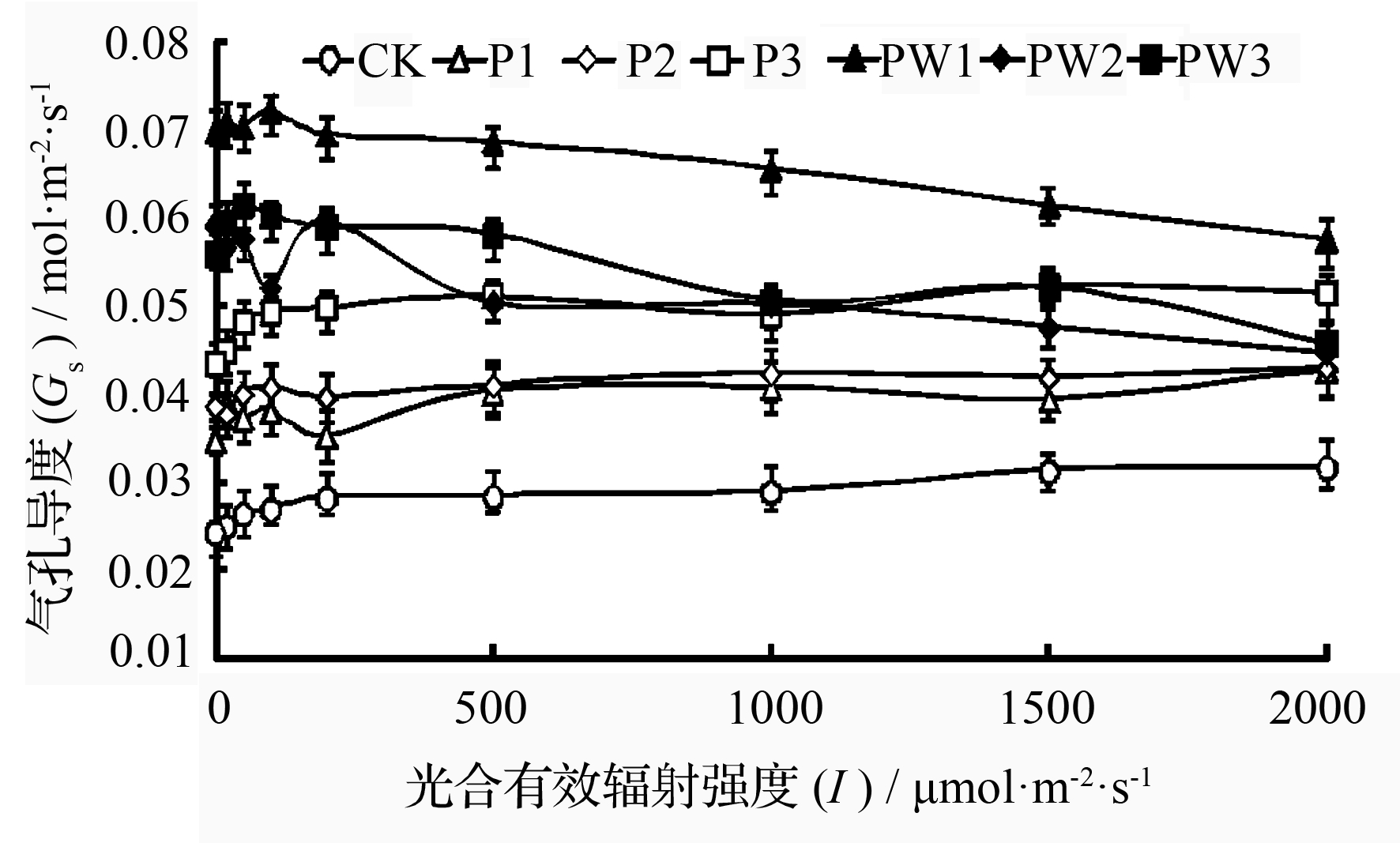 图2 气孔导度(Gs)的光响应曲线