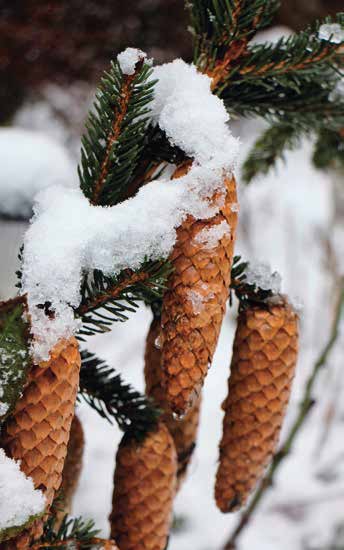 松针是一种异形树叶,和普通的叶子一样,它们通过光合作用为树木制造养料。而且由于它们四季常青,所以能源源不断地为树木输送养料。另外,针叶还有一项特殊功能——“隔离”积雪。雪花可以穿过细细的松针落在地上,而不是堆积在枝干上,将其压断。