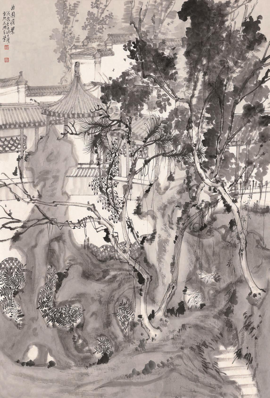 【摘要】我喜欢游园,但总择快闭园或雨雪之际。那时游人甚少,我喜欢一人独自享受那份宁静和安逸,偶尔再泡上一杯明前碧螺春,呆坐在茶室,望着窗外芭蕉、白皮松,恍如隔世。有时甚至化身与古时某画家置身园中,不断扣问,古人如何画园?为何今人画园少了那份让人遐想的怅然?想多了,画多了,就渐渐体悟到画园实则更多的是画人生体悟、笔墨修养、审美情愫、人文结构、哲学意识等等。近几年,也偶去园林写生,想在写生中去锤炼自己的笔墨,去研究自然和认识自然,去寻找自己全新的艺术形式及笔墨语言。面对自
