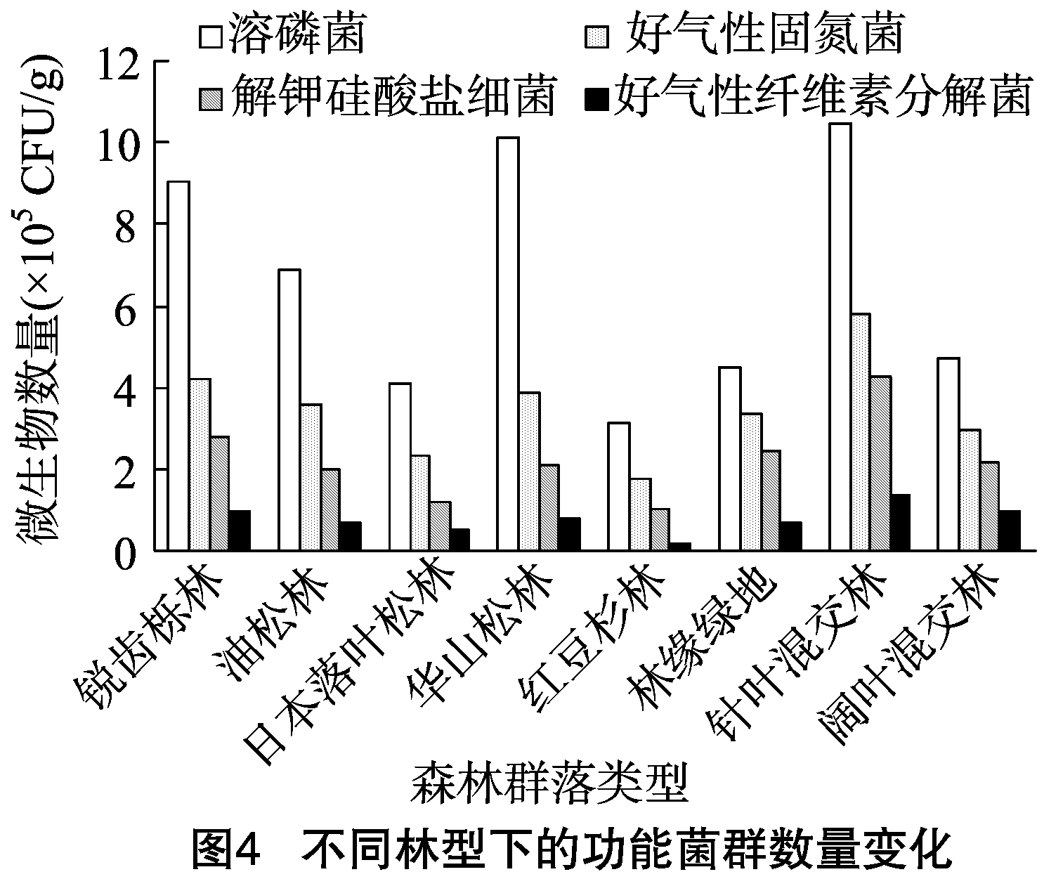 3.3.1 功能菌群特征 土壤中有特殊生理功能的微生物类群,如氨化细菌、亚硝化细菌、硝化细菌、反硝化细菌、固氮菌、纤维素分解菌、硫细菌等,在土壤物质转化上起着重要的作用[22]。对小陇山不同植被、林型土壤中的功能菌群进行鉴定,结果显示不同植被、林型土壤中的功能菌群数量特征总体表现为:溶磷菌>好气性固氮菌>解钾硅酸盐细菌>好气性纤维素分解菌。其中针叶混交林下土壤中的功能菌群数量最多,红豆杉林下土壤中的功能菌群数量最少(图4)。